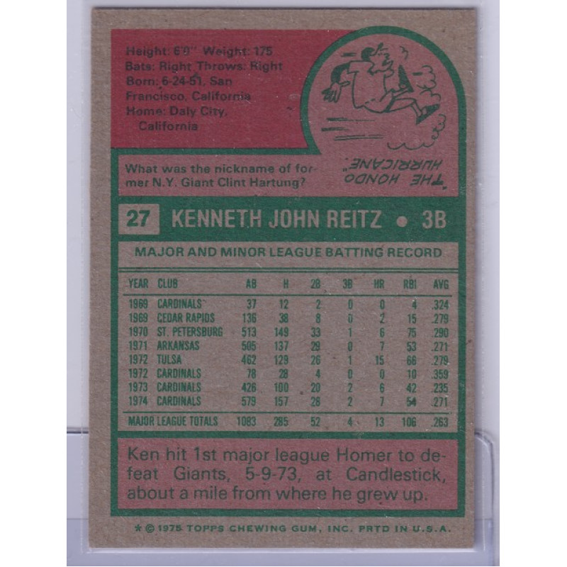 1975 Topps #27 Ken Reitz St. Louis Cardinals Signed Autograph